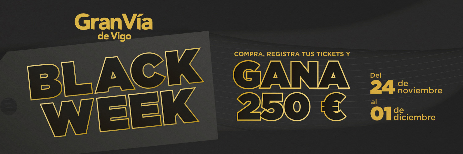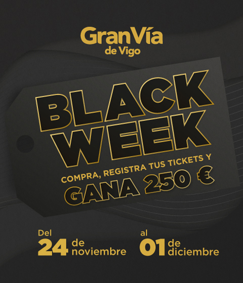 ¡Vive la Black Week en Gran Vía de Vigo! Esta semana, tus compras pueden convertirse en premio. Del 24 de noviembre al 1 de diciembre, registra tus tickets y participa en el sorteo de 2 tarjetas regalo de 250 € para seguir disfrutando de tus tiendas favoritas. Es el momento perfecto para aprovechar las ofertas del Black Friday, darte un capricho y, quién sabe… ¡quizás tus compras te devuelvan la suerte! Sube tus tickets ahora y entra en el sorteo. ¡Tu Black Week puede tener recompensa!