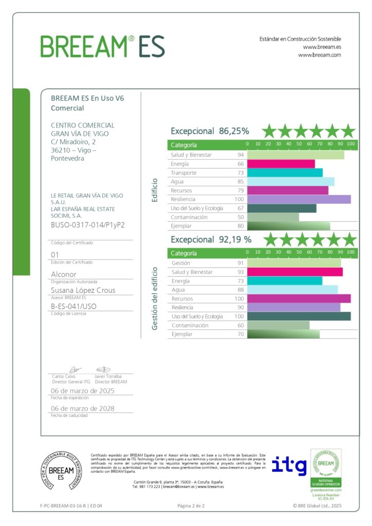 El Centro Comercial GRAN VIA DE VIGO considera la excelencia medioambiental como un valor fundamental de su estrategia empresarial. Por ello, realiza las actividades protegiendo el medio ambiente, conforme a los principios de desarrollo seguro y sostenible y a la gestión de riesgos ambientales, implementando mejoras que permiten proteger el edificio de su entorno, luchar contra el cambio climático, proteger la biodiversidad, así como reducir los consumos de recursos y materias primas, la generación de residuos y las emisiones inherentes a la actividad.