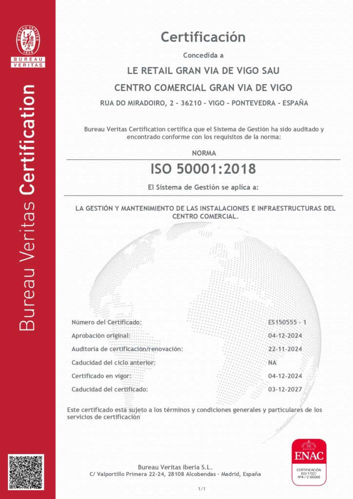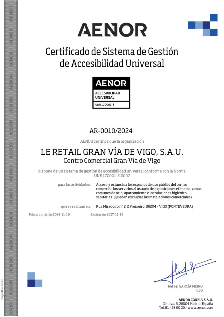 Para hacer efectiva esta política de manera eficaz, el Centro Comercial GRAN VÍA DE VIGO, a través de la sociedad LE RETAIL GRAN VÍA DE VIGO SAU tiene implantado un sistema de gestión de la accesibilidad universal conforme a la UNE 170001-2, que mejora de manera continua.